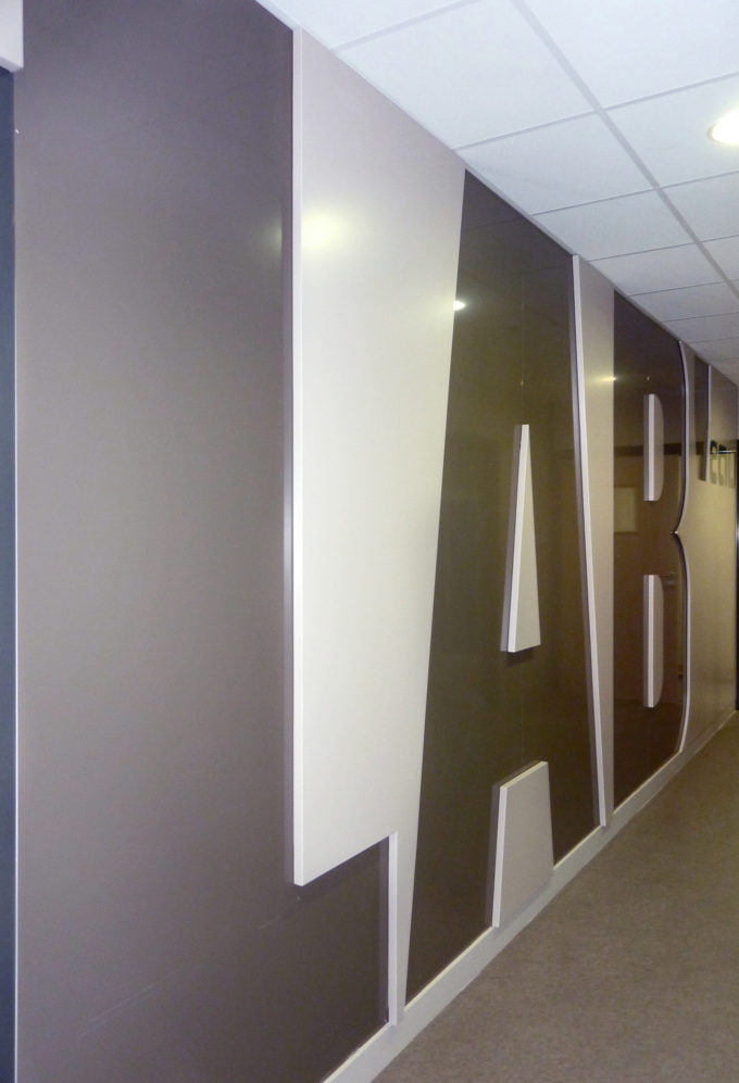 La Connexion des différents services (au nombre de trois), notion phare dégagée avec le maître d’ouvrage, est symbolisée par l’anamorphose de la bouteille d’eau. En entrant sur le plateau, c’est la vue globale de la bouteille qui se lie , métaphore de la symbiose des trois services travaillant d’unisson sur cette réalisation du packaging.